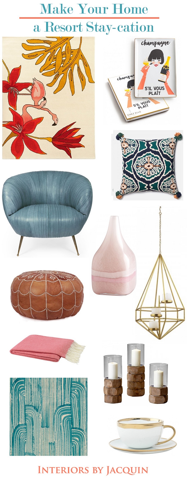 It's Monday and you're likely thinking about how much you could use a vacation. If you're like me, you're far to busy to disappear for a vacation whenever you need one, but there is a solution! Why not create a resort-style retreat at home? That way you can enjoy a little rest & relaxation in a beautifully decorated space ANYTIME! I've put together a stay-cation inspired e-design to get you motivated and inspired. You can shop all of these finds and create your own vacation destination at home. Just hover your cursor over the image and each individual item will be hyperlinked with a shopping tag for you to click. I am loving this new technology! Now it's easier than ever to beautify your home.